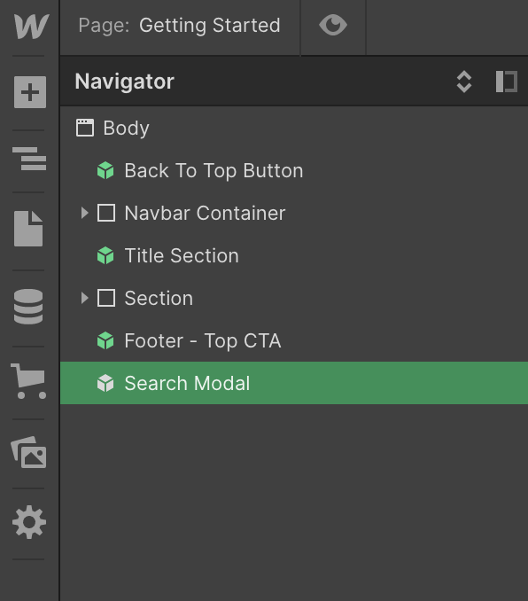 Wenn Sie eine der Navigationsleisten verwenden, die über eine Suchfunktion verfügt, müssen Sie sicherstellen, dass das Symbol Search Modal als letztes Element im Hauptteil der Seite platziert wird.